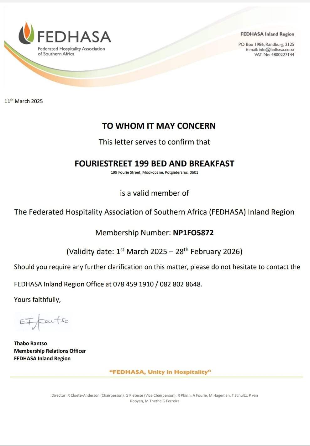 Fouriestreet199 Bed and Breakfast is situated in the heart of Mokopane and offers a welcoming accommodation for business travellers, contractors and visitors exploring the area. With a reputation for clean, friendly and affordable accommodation, we ensure that every guest experiences true South African hospitality.